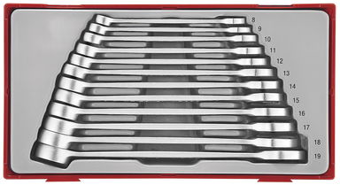 Zostań partneremZestaw 12 kluczy płasko-oczkowych ze stali chromowo-wanadowej, ten sam rozmiar na obu końcach. Główka pierścieniowa dwunastokątna pogłębiona, odgięta pod kątem 15°. Koniec otwarty wykonany w systemie hip-grip, z rowkami przeciwpoślizgowymi. Część chwytowa zwężana w kierunku końców dla polepszenia wygody trzymania. Otwór w części chwytowej do zabezpieczenia narzędzia.