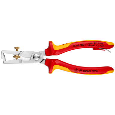 Szczypce z zintegrowanym zaczepem izolowanym do zamocowania zabezpieczenia przed upadkiem w trakcie pracy Wbudowany obcinak do kabli precyzyjnie tnący kable miedziane i aluminiowe bez deformacji Twardość ostrzy ok. 57 HRC Uniwersalna regulacja ostrzy do ściągania izolacji za pomocą śruby radełkowanej Zwarta konstrukcja ułatwia pracę w trudno dostępnych miejscach Ściąganie izolacji z jedno- i wielożyłowych oraz bardzo cienkich kabli plecionych z izolacją z tworzywa sztucznego lub gumową o średnicy do 5 mm lub przekroju poprzecznym do 10 mm2 Stopniowana szczęka zapewnia orientację wizualną podczas ściągania izolacji z drutów na standardową długość (11 mm i 16 mm)