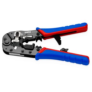 Uniwersalne narzędzie do cięcia kabli, ściągania izolacji z kabli okrągłych i zagniatania powszechnie stosowanych złączy RJ45 Bezpieczne zagniatanie ekranowanych i nieekranowanych złączy RJ45 Western (8P8C) Regulowany zatrzask, do wszystkich powszchnie stosowanych złączy RJ45 z zamkniętą i otwartą obudową