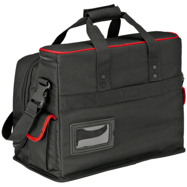 Wyściełana kieszeń wewnętrzna na notebook i dokumenty DIN A4, dodatkowa kieszeń wielkości DIN A4 zamykana na zamek Kieszeń przednia z 8 kieszonkami i 1 małą kieszenią wewnętrzną, rozkładana pod kątem 90° Strona tylna kieszeni zewnętrznej posiada 5 uchwytów na narzędzia i 3 uchwyty na długopisy 1 wyjmowana ścianka wewnętrzna z 8 uchwytami na narzędzia od strony górnej i 2 rzędami elastycznych pętli od strony dolnej Pojemnik denny zabezpieczony przed przedostawaniem się kropel wody Regulowany pasek z zapięciem Z dwoma uchwytami Torba bez narzędzi