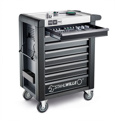 Optymalna organizacja: Wszystkie szuflady można wysunąć do 100%. W połączeniu z wkładkami STAHLWILLE standard i TCS lub zmiennymi przegrodami szuflad zapewniają przejrzystość i wygodny dostęp do narzędzi.